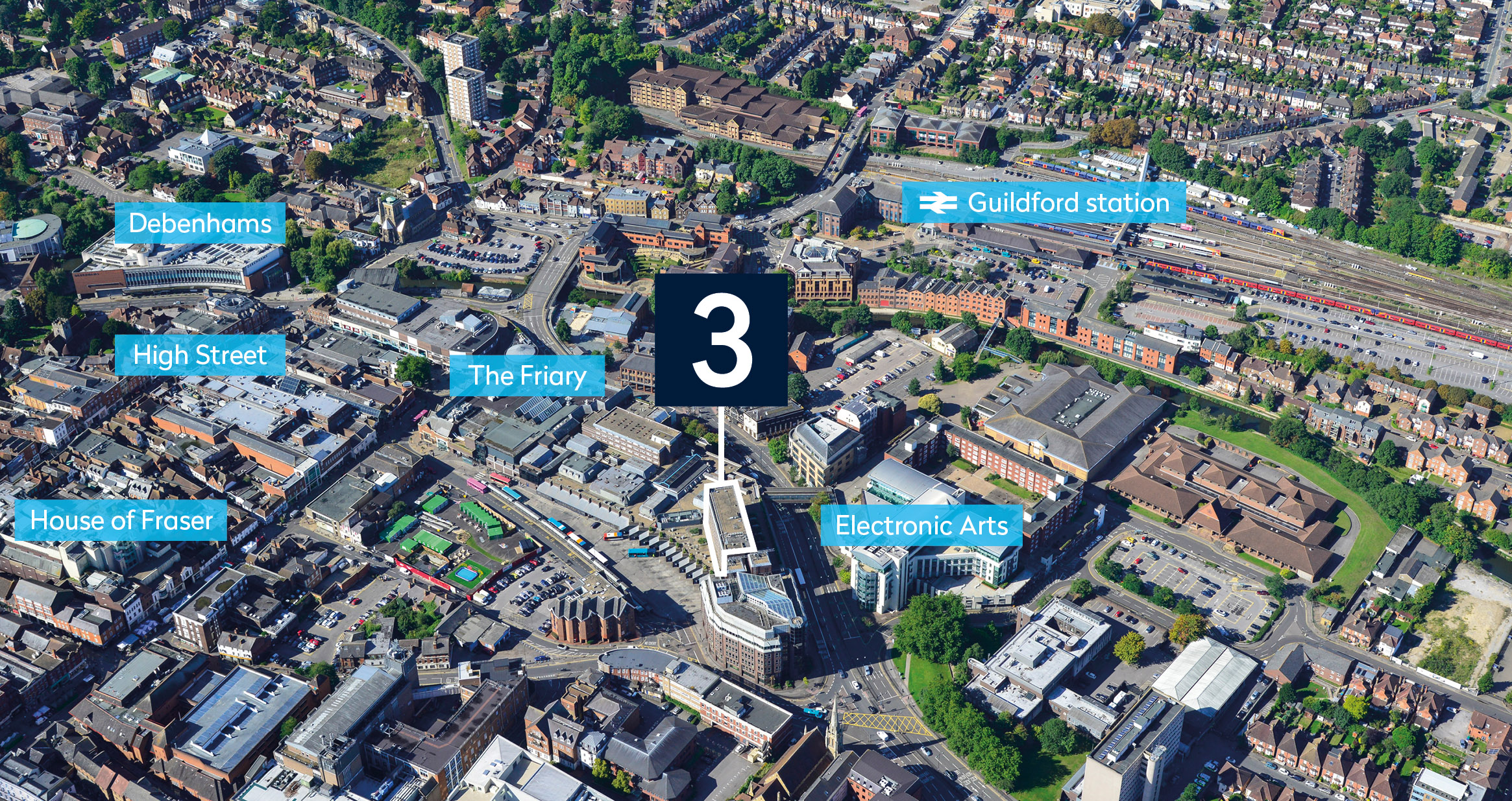 3 Onslow Street is located in the centre of Guildford, close to the junction with Woodbridge Road. Major occupiers in the immediate vicinity include Aventis and Electronic Arts.